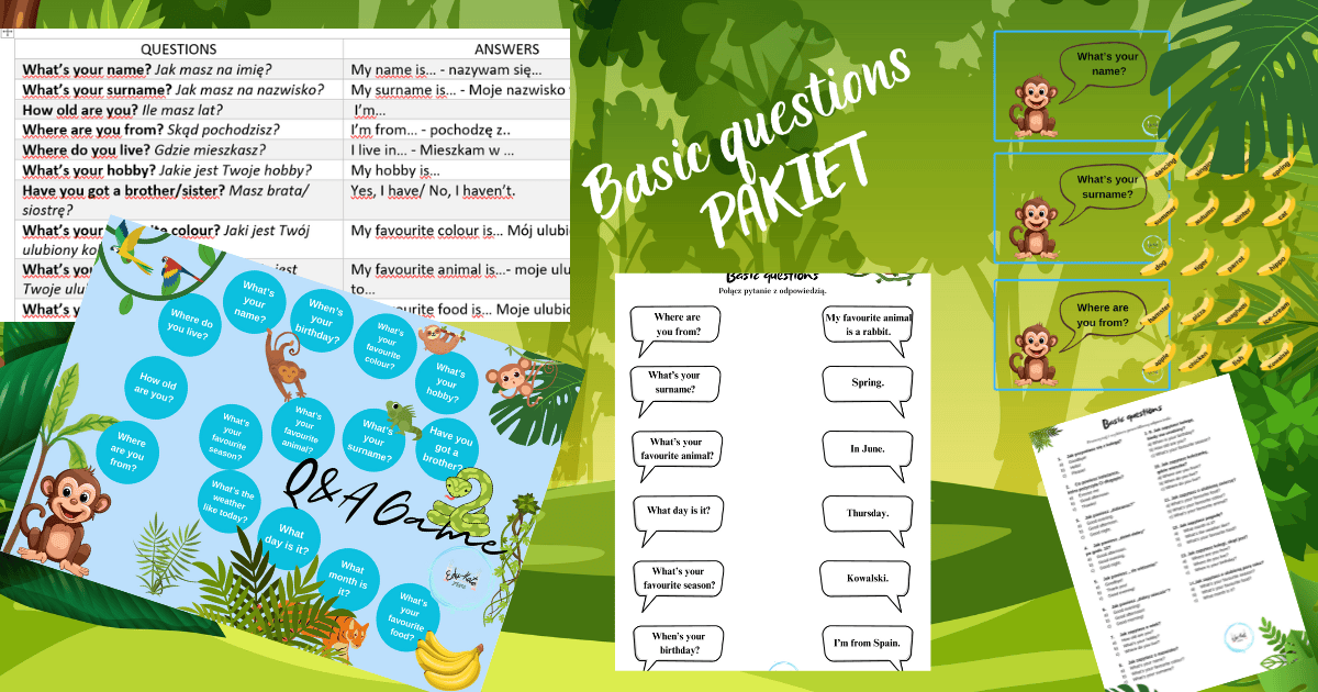 Szukasz sposobu na lepsze opanowanie podstawowych pytań w języku angielskim przez Twoich uczniów? Mój zestaw "Basic Questions" to idealne rozwiązanie! 🌟📚 📦 W zestawie znajdziesz wszystko, czego potrzebujesz, aby utrwalić te pytania: ✏️ Wklejka do zeszytu 🎲 Gra planszowa 🃏 Karty z pytaniami i przykładowymi odpowiedziami: Doskonałe do nauki w parach lub grupach. 📝 Karta pracy (A, B lub C): Wybierz właściwą odpowiedź - doskonała praktyka dla każdego. 🧩 Karta pracy: Połącz pytanie z odpowiedzią ❓ Karta pracy: Stwórz własne pytanie do odpowiedzi 🎉 Dodatkowo, dostajesz karty z pytaniami z wklejki i kilka dodatkowych, które możesz wykorzystać do zabaw, jak Kaboom lub stworzyć mini-quizy. Możesz je nawet wsadzić do pudełek po Kinder niespodziance i na każdej lekcji jeden z uczniów losuje pytanie, przez co możemy je używać co lekcje!